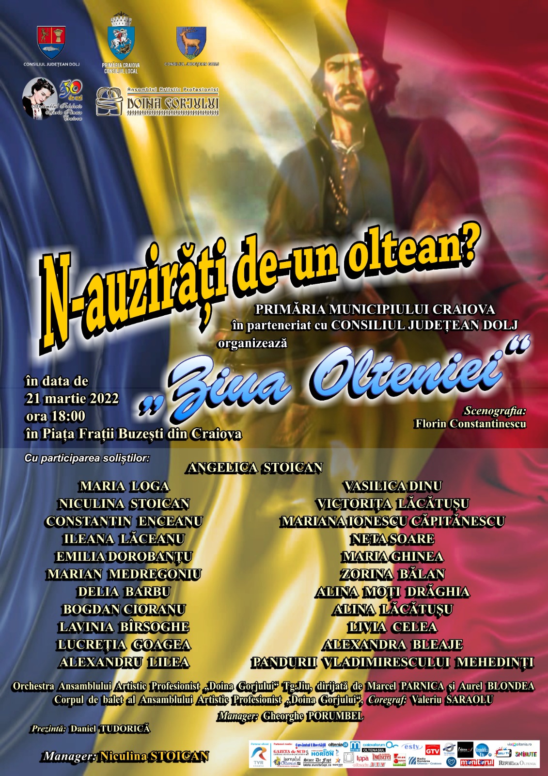 Organizate de Primăria Craiova, în parteneriat cu Consiliul Județean Dolj, toate manifestările dedicate oltenilor pentru ziua de 21 martie 2022 vor fi cu intrare liberă: de la expoziții în aer liber sau la sediul instituțiilor de cultură și până la spectacolul de tradiții N-auzirăți de-un oltean propus de Ansamblul Folcloric Maria Tănase, pe scena din Piața Frații Buzești - Centrul Vechi.