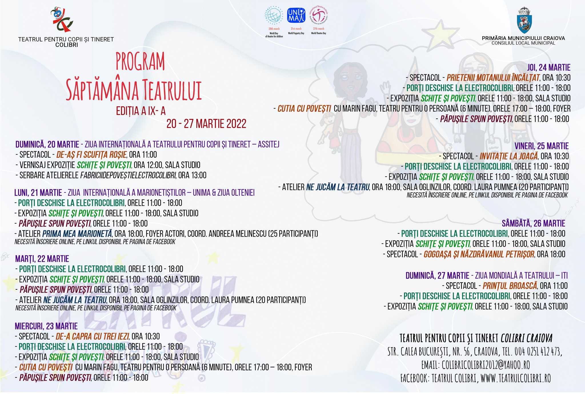 - Atelier Prima mea marionetă (copiii învață să construiască marionete din materiale reciclabile), ora 18:00, Foyer actori, coord. Andreea Melinescu (25 participanți)